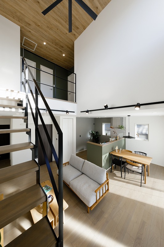 吹抜けとアイアン階段がある洗練された空間の家