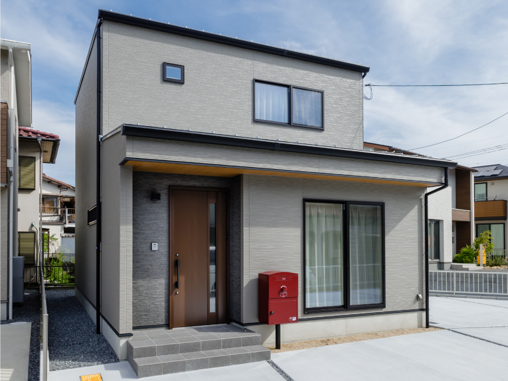 ●都会的ですっきりとしたクールグレーの外壁、板目の軒裏がワンポイントアクセント