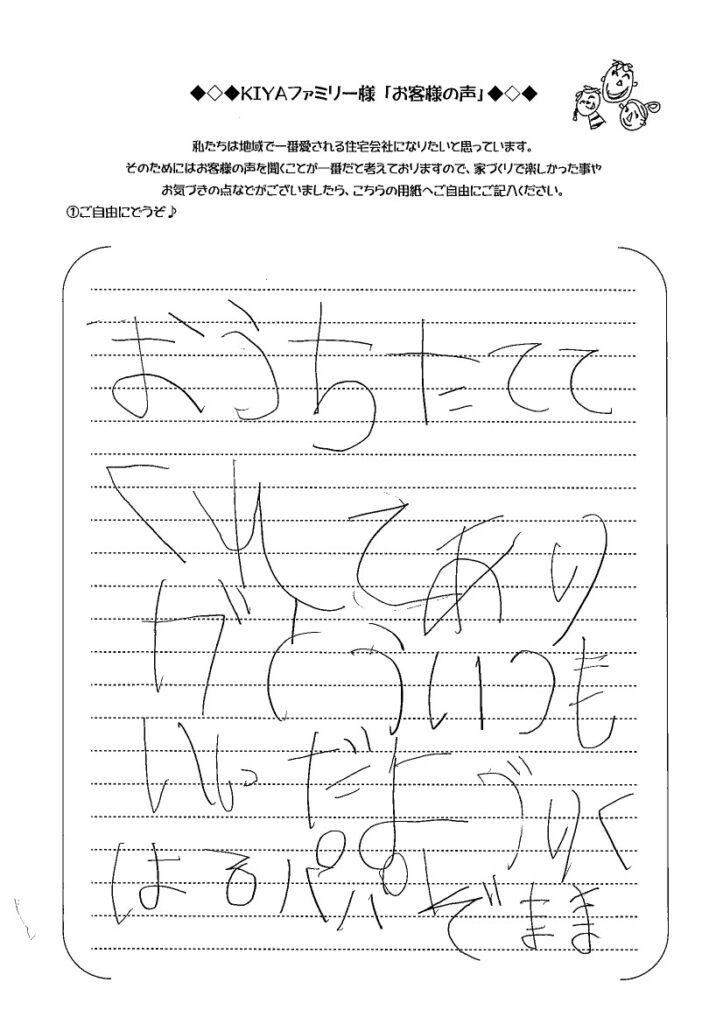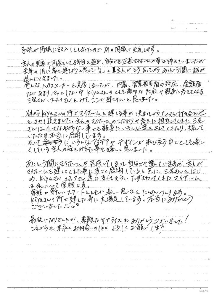 あっという間にマイホームが完成してしまって自分でも驚いていますが、主人がマイホームを建ててくれた事にすごく感謝していると共に、三宅さんをはじめ、Kiyaさんスタッフさん達に支えてもらい、たずさわってくれたマイホームは私にとって宝物です。家族で新しいスタートとともに楽しい思い出をたくさんつくります。Kiyaさんの所で建てた事に大満足しています。本当にありがとうございました😊