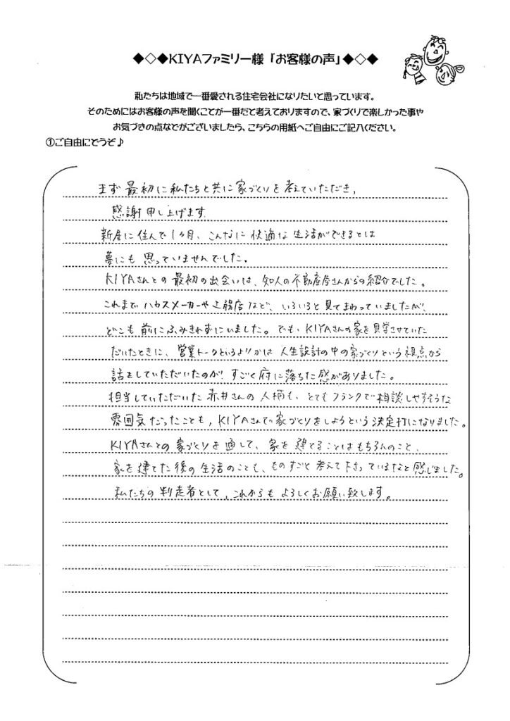 担当していただいた赤井さんの人柄も、とてもフランクで相談しやすそうな雰囲気だったことも、KIYAさんで家づくりをしようという決定打になりました。KIYAさんとの家づくりを通して、家を建てることはもちろんのこと、家を建てた後の生活のことも、ものすごく考えて下さっているなと感じました。私たちの伴走者として、これからもよろしくお願い致します。