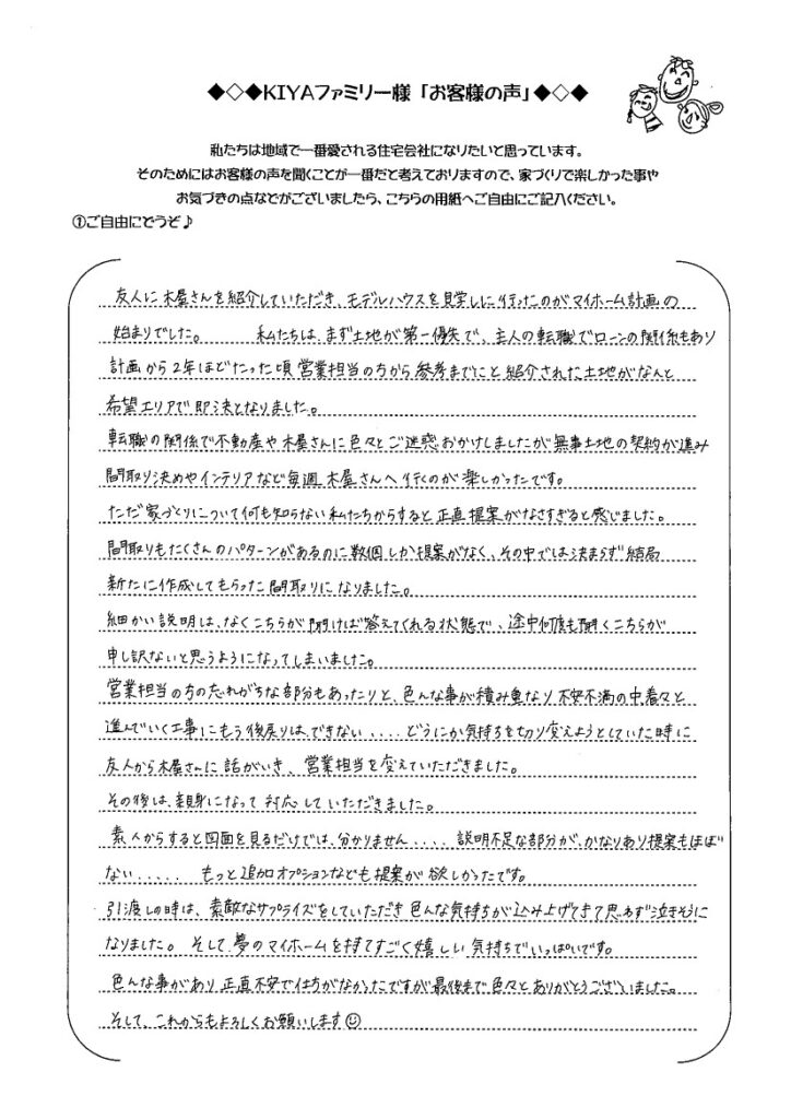 友人に木屋さんを紹介していただき、モデルハウスを見学しに行ったのがマイホーム計画の始まりでした。私たちはまず土地が第一優先で、主人の転職でローンの関係もあり、計画から2年ほどたった頃営業担当の方から参考までにと紹介された土地がなんと希望エリアで即決となりました。