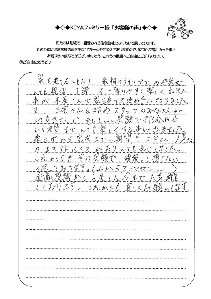 家を建てるにあたり、最初のライフプランの作成でとても親切、丁寧、そして解りやすく楽しく出来た事が木屋さんで家を建てる決め手になりました。又、三宅さんを始めスタッフのみなさんがとてもきさくで、そしていい笑顔で打ち合わせから建築までとても楽しくする事が出来ました。棟上げから完成までの期間も三宅さん、人見さんのよきアドバイスがありとても安心しました。