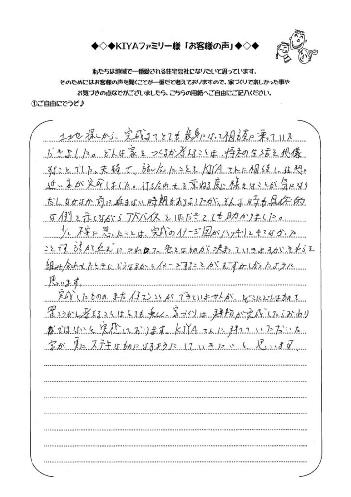 土地探しから、完成までとても親身になって相談に乗っていただきました。どんな家をつくるか考えることは、将来の生活を想像することでした。夫婦で、話し合ったことをKIYAさんに相談し理想へ近い家が完成しました。打ち合わせを重ねる度に様々なことが気になりだし、なかなか前に進まない時期もありましたが、そんな時も具体的な例を示しながらアドバイスをいただきとても助かりました。