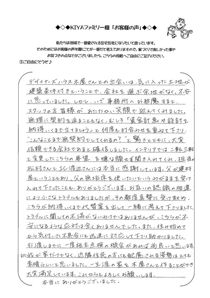 また我が家だけでなく、近隣住民の方にも配慮される姿勢はとても素晴らしいと思いました。一生涯の家を木屋さんと作ることができ大変満足しています。これからもよろしくお願いします。本当にありがとうございました。
