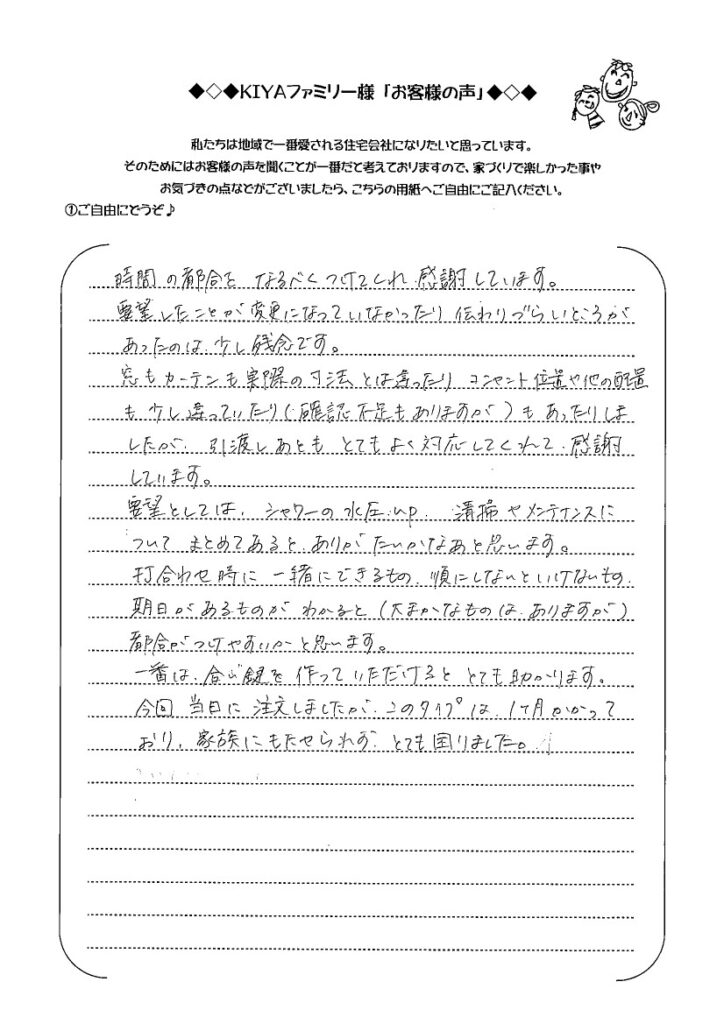 窓もカーテンも実際の寸法とは違ったりコンセント位置や他の配置も少し違っていたり(確認不足もありますが)もあったりしましたが、引渡しあともとてもよく対応してくれて、感謝しています。
