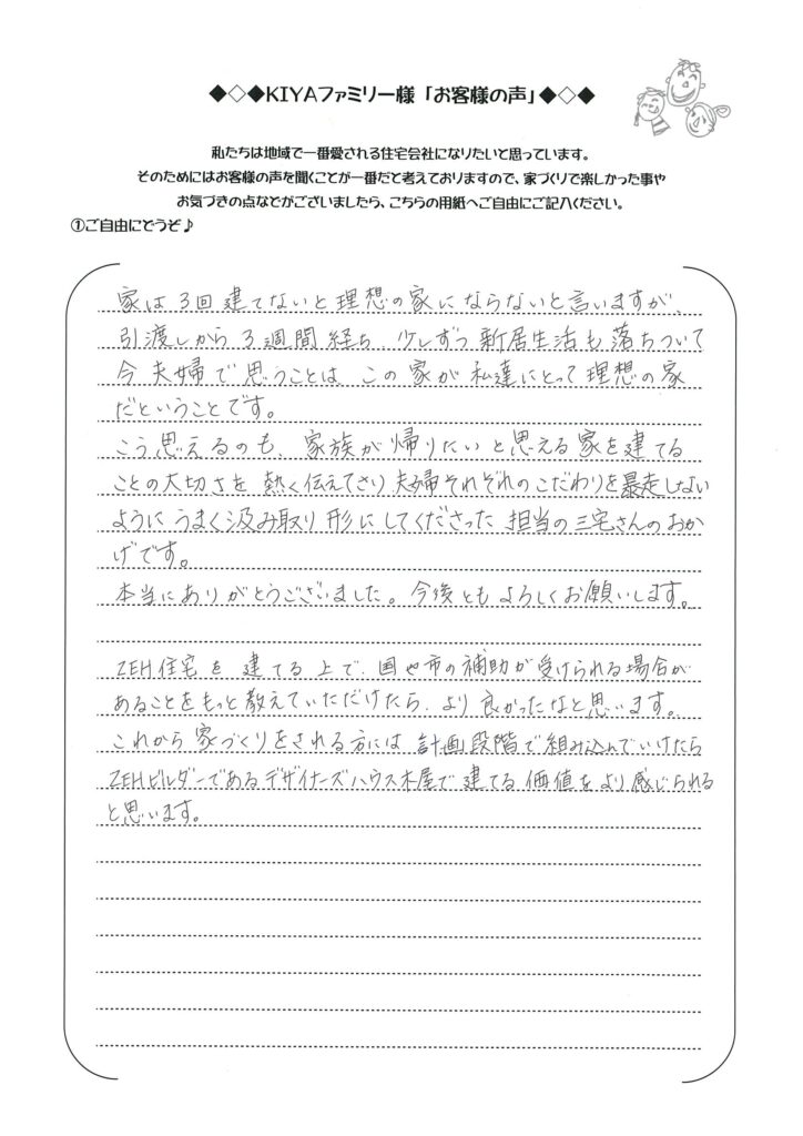ZEH住宅を建てる上で、国や市の補助が受けられる場合があることをもっと教えていただけたら、より良かったなと思います。これから家づくりをされる方には計画段階で組み込んでいけたらZEHビルダーであるデザイナーズハウス木屋で建てる価値をより感じられると思います。