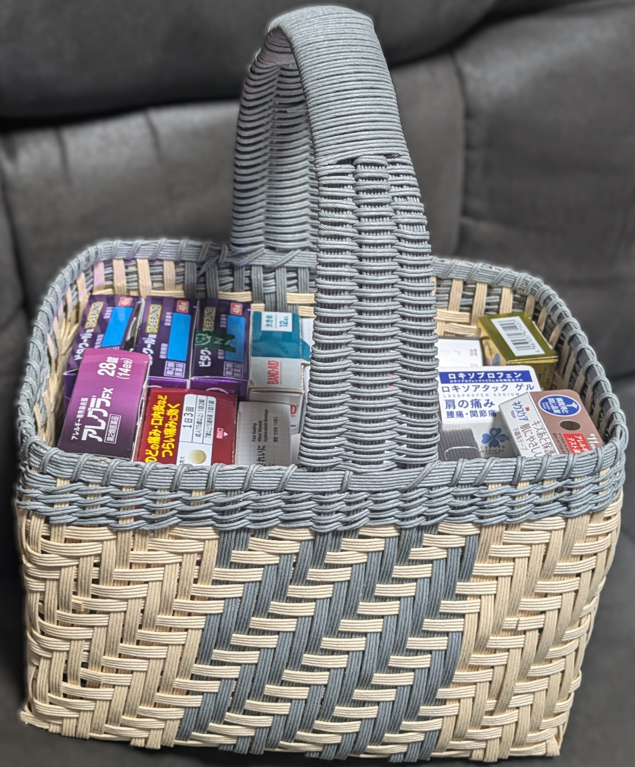 化粧品用のかご、四つだたみ編みのバックを愛用中♪