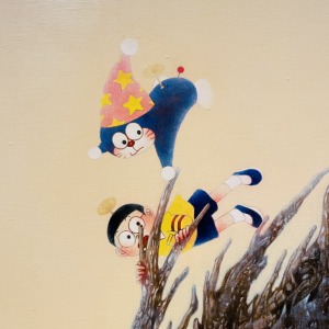 ひみつ道具『重力ちょうせつ機』によって、のび太の部屋の中のモノが全て重力を失っている絵です。ドラえもんの顔がとっても可愛くて(笑)