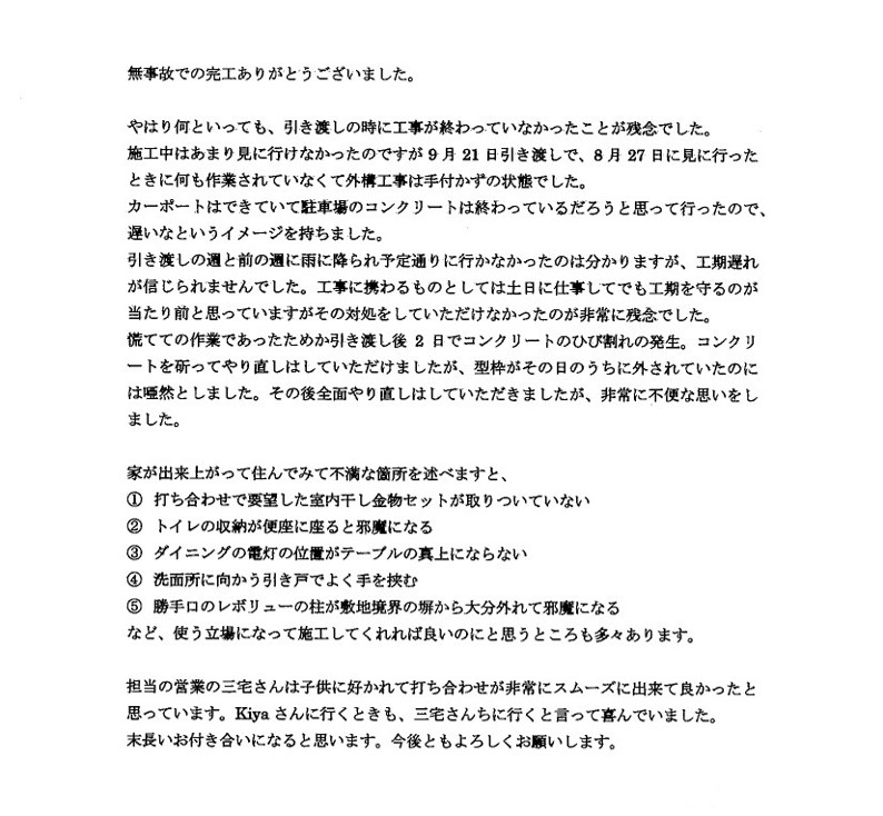 やはり何といっても、引き渡しの時に工事が終わっていなかったことが残念でした。