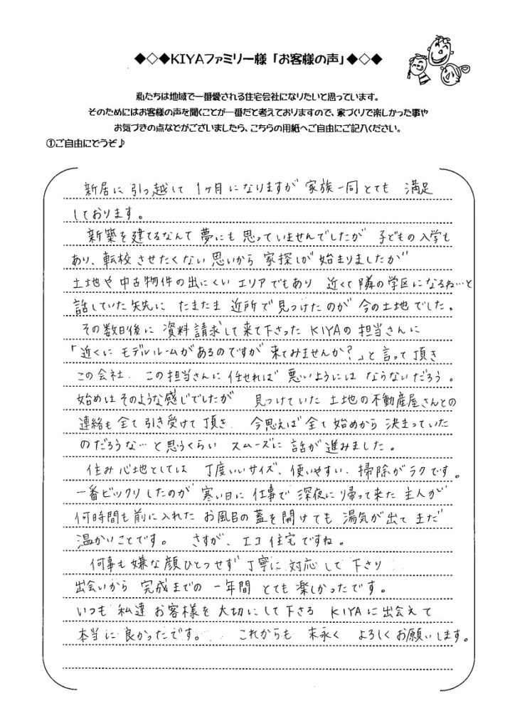 新居に引っ越して1ヶ月になりますが家族一同とても満足しております。