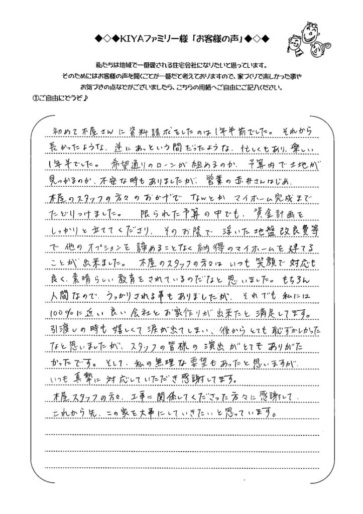 初めて木屋さんに資料請求をしたのは1年半前でした。それから長かったような、逆にあっという間だったような、忙しくもあり、楽しい1年半でした。希望通りのローンが組めるのか、予算内で土地が見つかるのか、不安な時もありましたが、営業の赤井さんはじめ、木屋のスタッフの方々のおかげでなんとかマイホーム完成までたどりつけました。