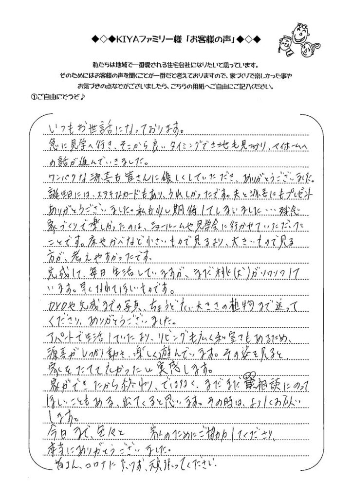 家づくりで楽しかったのは、ショールームや見学会に行かせていただいたことです。床やカベなど小さいもので見るより、大きいもので見る方が、考えやすかったです。完成して、毎日生活していますが、まだ桃(犬)がソワソワしています。早くなれてほしいものです。DVDや完成までの写真、ちょうど良い大きさの植物まで送ってくださり、ありがとうございました。