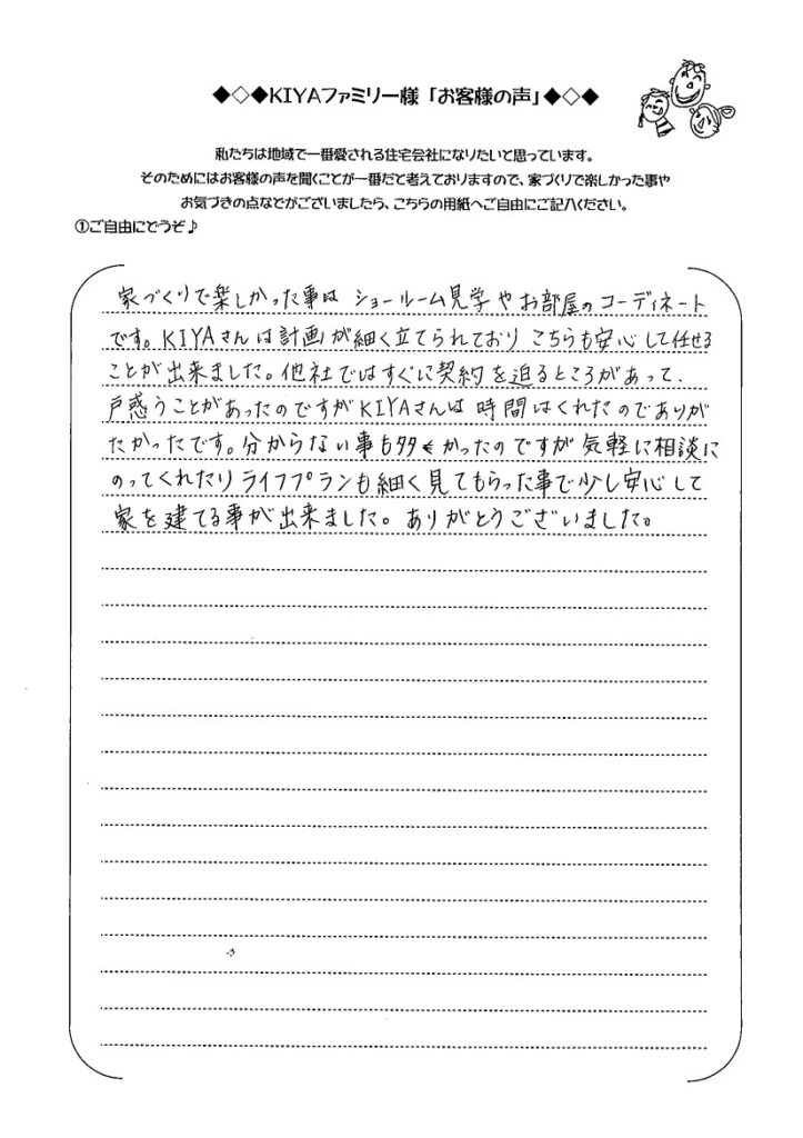 分からない事も多かったのですが気軽に相談にのってくれたりライフプランも細く見てもらった事で少し安心して家を建てる事が出来ました。ありがとうございました。