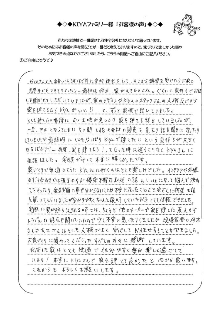 実際に家が建ちはじめる時には、ちょうど他のメーカーで家を建てた友人からトラブルの話など聞いていたので少し不安に思ったりしましたが、現場監督の河本さんや大工さんはとても人柄がよく安心してお任せすることができました。お家づくりに関わってくださったすべての方々に感謝しています。完成した家はとても快適で住みやすく毎日楽しく過ごしています!本当にKiyaさんで家を建てて良かったと心から思います。これからもよろしくお願いします。