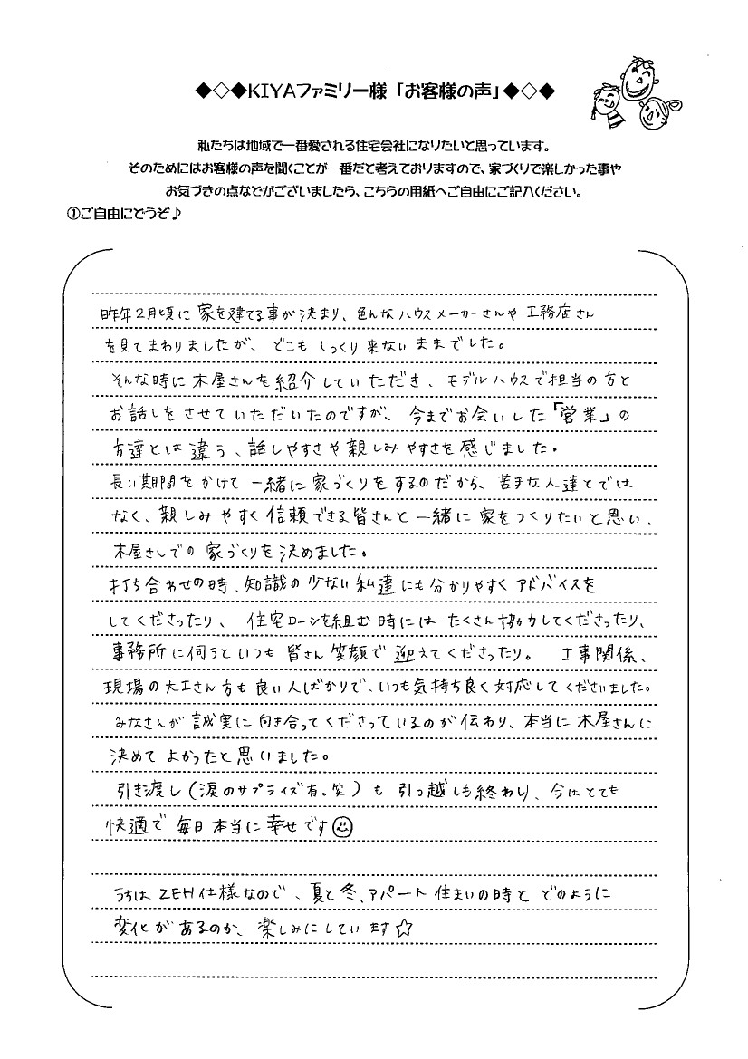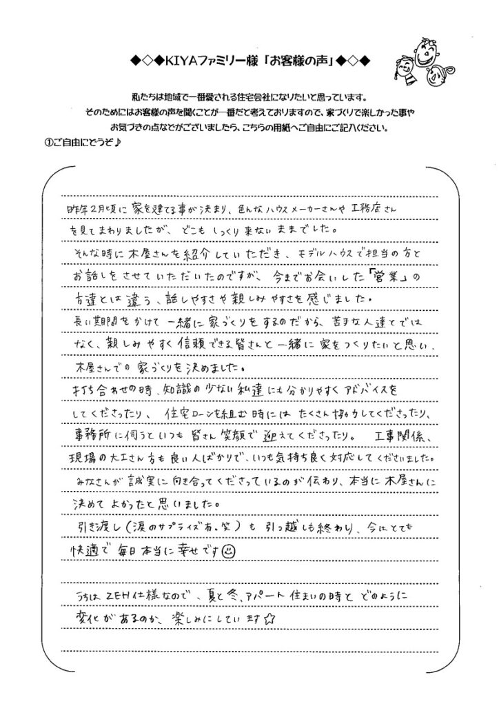 打ち合わせの時、知識の少ない私達にも分かりやすくアドバイスをしてくださったり、住宅ローンを組む時にはたくさん協力してくださったり、事務所に伺うといつも皆さん笑顔で迎えてくださったり。工事関係、現場の大工さん方も良い人ばかりで、いつも気持ち良く対応してくださいました。