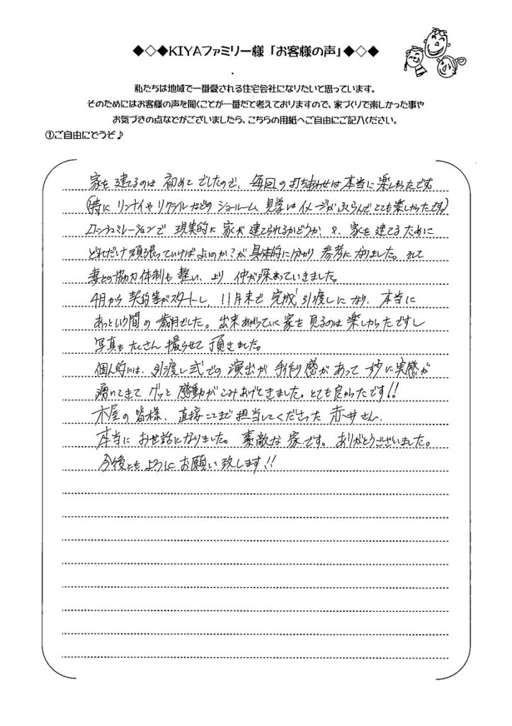 木屋の皆様、直接ここまで担当してくださった赤井さん、本当にお世話になりました。素敵な家です。ありがとうございました。今後ともよろしくお願い致します!!