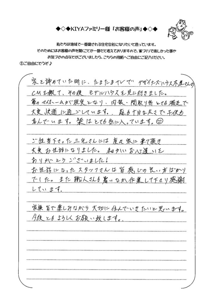 ご担当下さった三宅さんには度々家に来て頂き大変お世話になりました。細かいお心遣いをありがとうございました!お世話になったスタッフさんは皆感じの良い方ばかりでした。また職人さんも暑いなか作業して下さり感謝しています。家族皆で楽しみながら大切に住んでいきたいと思います。今後ともよろしくお願い致します。