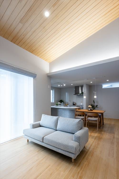 無垢板の天井と無垢の床で木のぬくもりを感じられる空間に、間接照明を取り入れて落ち着いた雰囲気を演出。