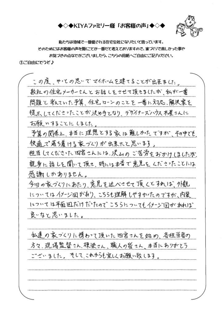 今回の家づくりにあたり、意見を述べさせて頂くとすれば、外観についてはイメージ図があり、こちらも理解しやすかったのですが、内装については平面図だけだったのでこちらについてもイメージ図があれば良いなと思いました。