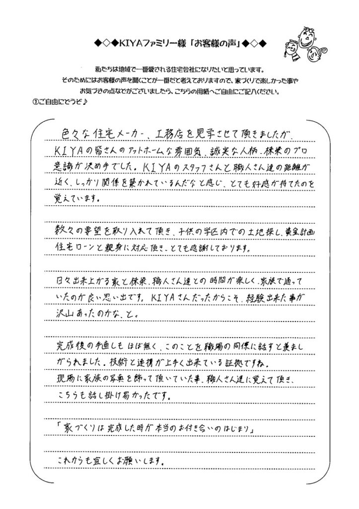 KIYAの皆さんのアットホームな雰囲気、誠実な人柄、棟梁のプロ意識が決め手でした。