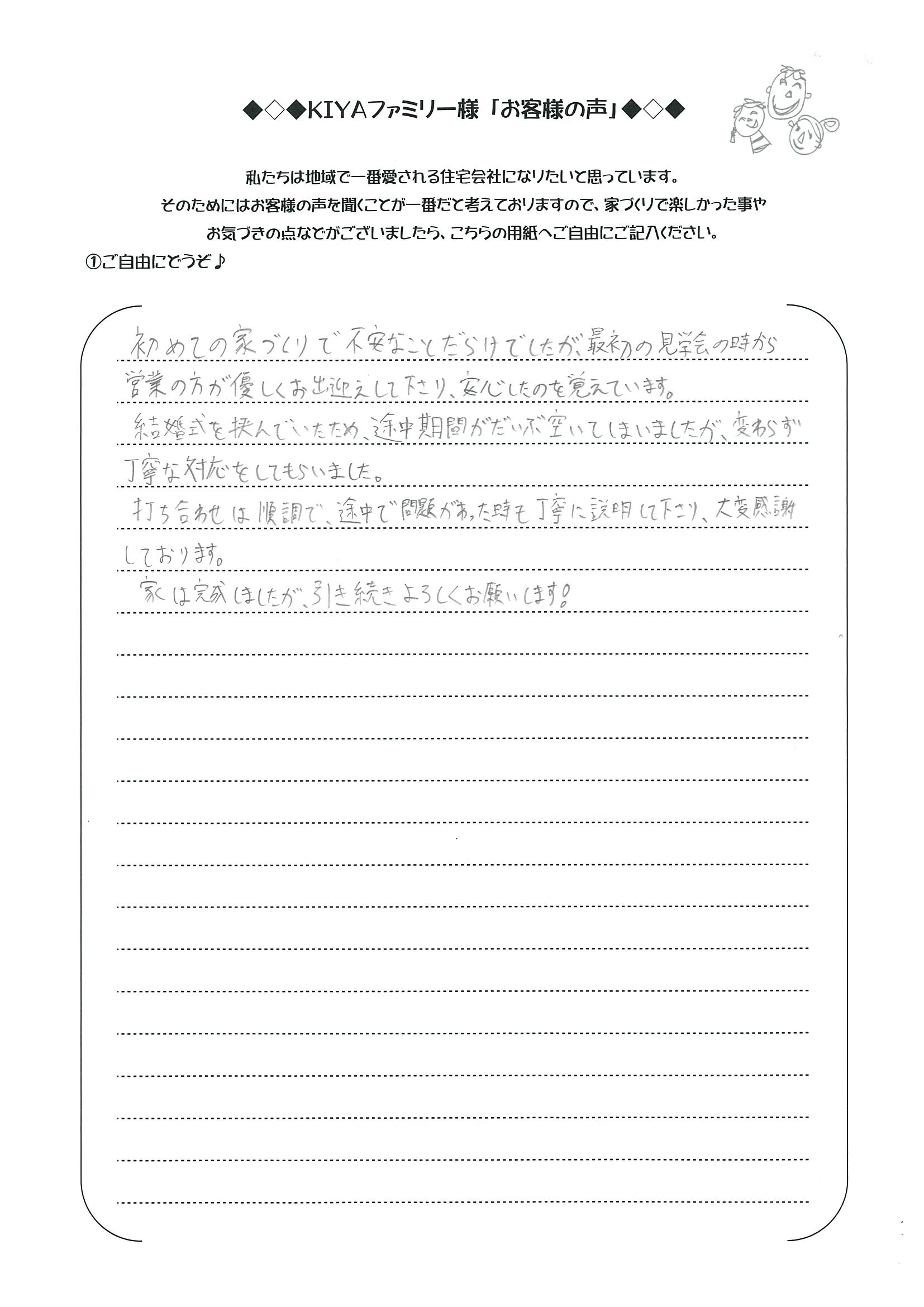 初めての家づくりで不安なことだらけでしたが、最初の見学会の時から営業の方が優しくお出迎えしてくださり、安心したのを覚えています。