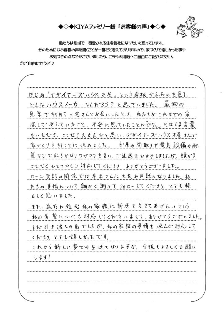 また、遠方に住む私の家族に新居を見せてあげたいという私の要望についても対応してくださいまして、ありがとうございました。