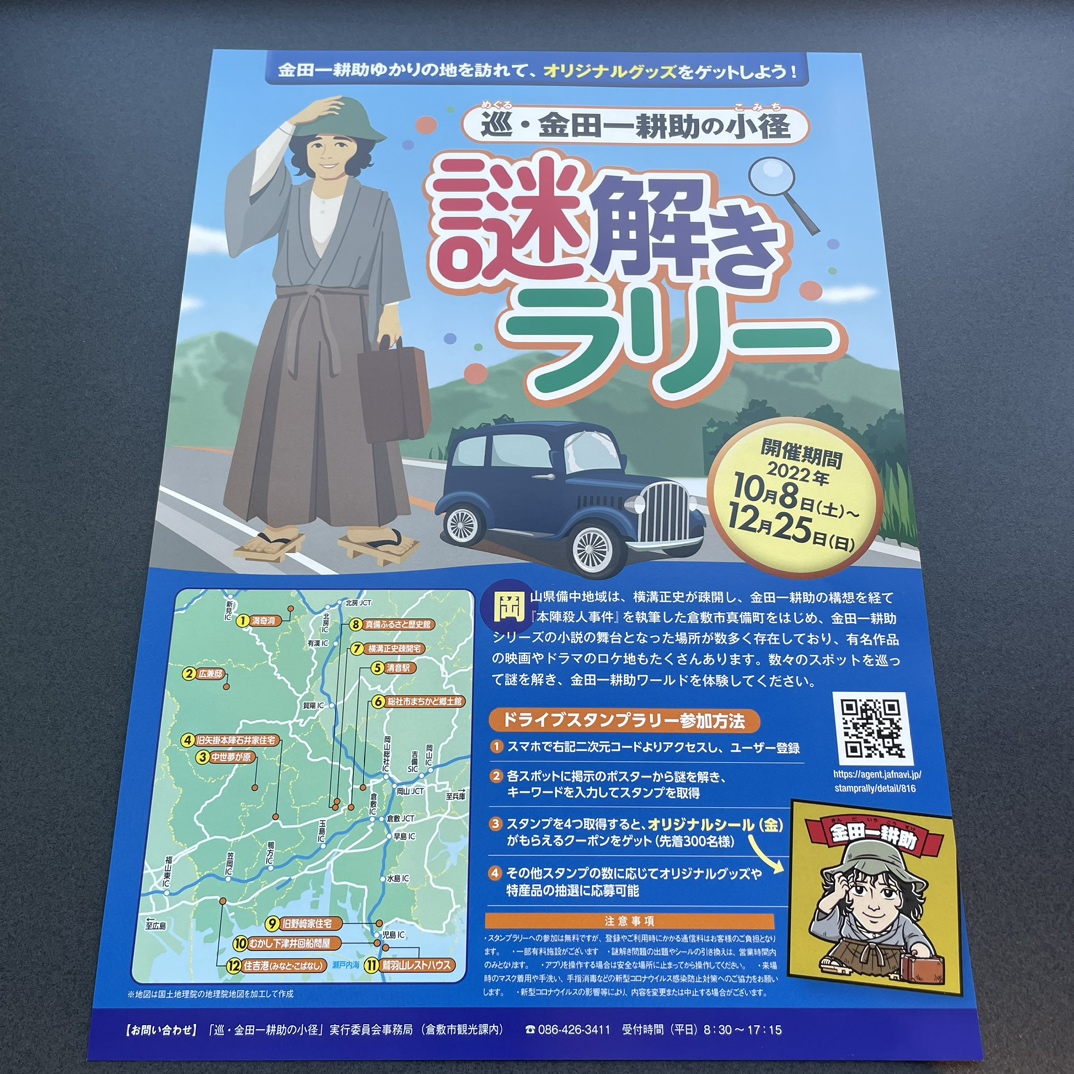 休日に何しようかと考えていた時に、以前、職人さんから「こんなイベントがあるよ!」と教えてもらったのが倉敷市や総社市などでやっている「巡・金田一耕助の小径 謎解きラリー」で、早速行ってみました!