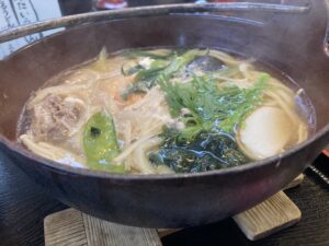 その日はちょうど雨模様で肌寒かったため鍋焼きうどんをチョイス。