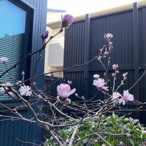 ヒメコブシと沈丁花で一気に春を迎える庭、