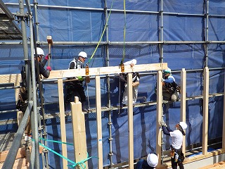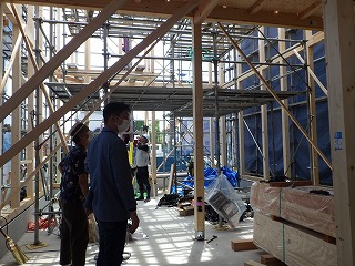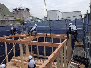 2階の梁も見事なチームワークで組み立てていきます!