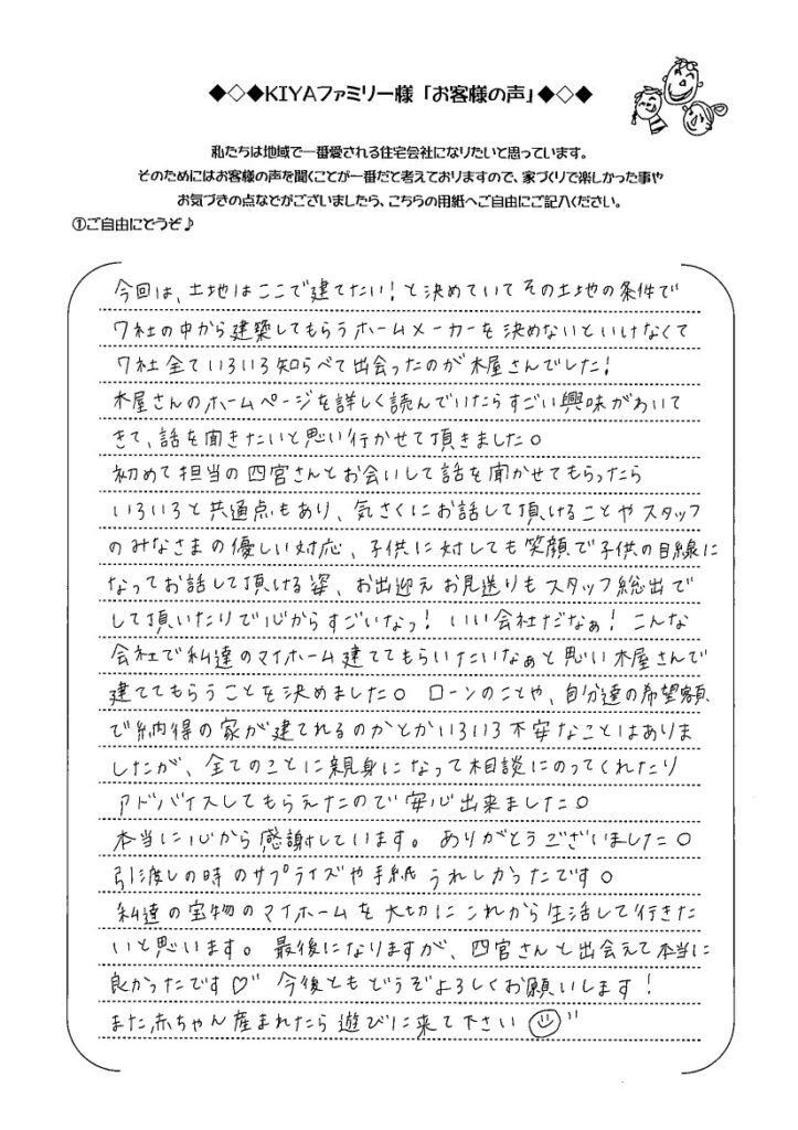 初めて担当の四宮さんとお会いして話を聞かせてもらったらいろいろと共通点もあり、気さくにお話して頂けることやスタッフのみなさまの優しい対応、子供に対しても笑顔で子供の目線になってお話して頂ける姿、お出迎えお見送りもスタッフ総出でして頂いたりで心からすごいなっ!いい会社だなぁ!こんな会社で私達のマイホーム建ててもらいたいなぁと思い木屋さんで建ててもらうことを決めました。