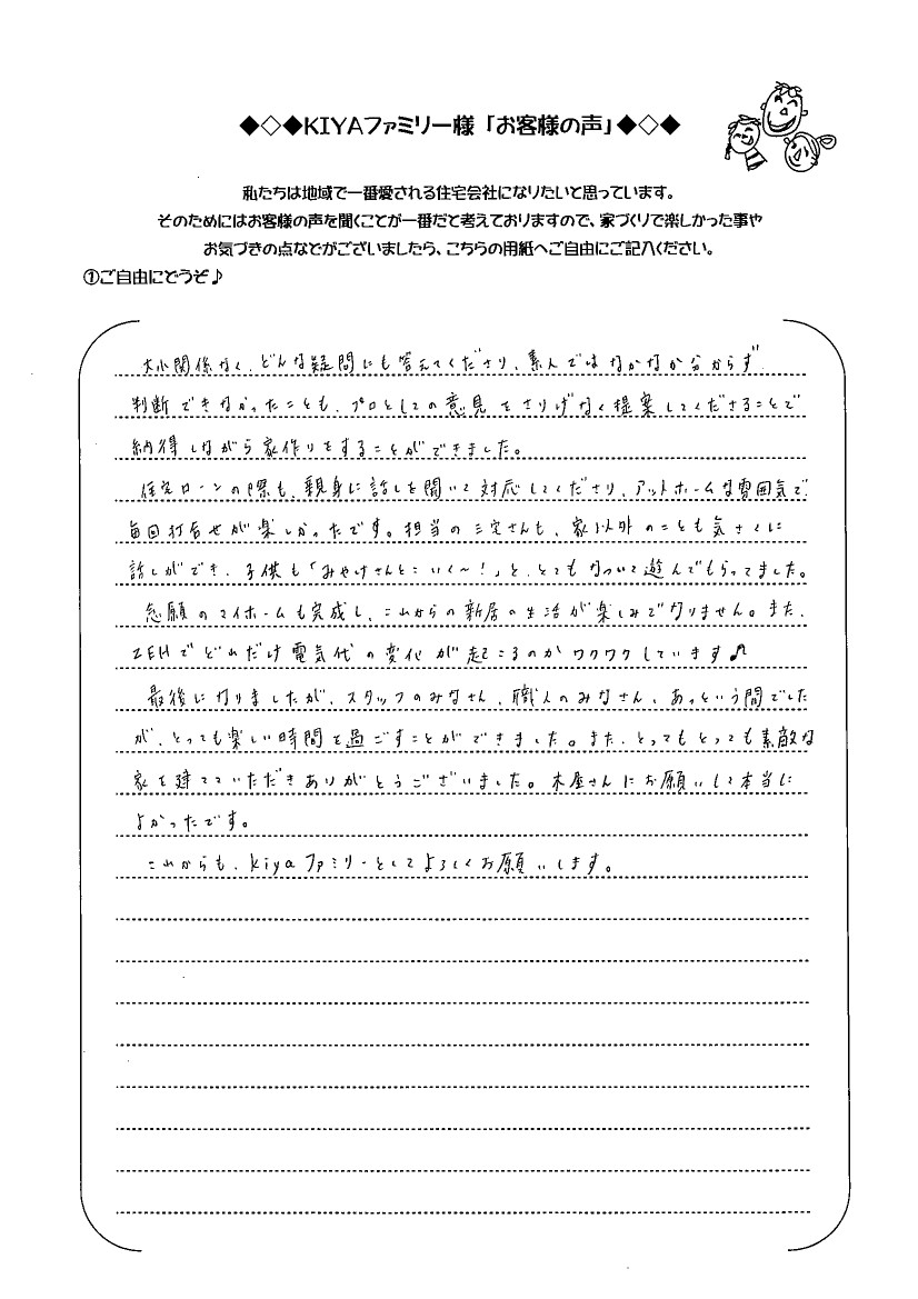 大小関係なく、どんな疑問にも答えてくださり、素人ではなかなか分からず判断できなかったことも、プロとしての意見をさりげなく提案してくださることで納得しながら家作りをすることができました。住宅ローンの際も、親身に話を聞いて対応してくださり、アットホームな雰囲気で毎回打合せが楽しかったです。担当の三宅さんも、家以外のことも気さくに話ができ、子供も『みやけさんとこいく~!』と、とてもなついて遊んでもらってました。