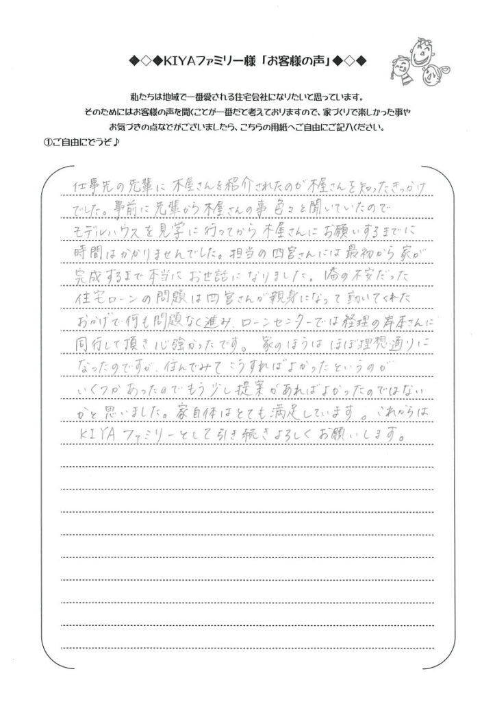 1番の不安だった住宅ローンの問題は四宮さんが親身になって動いてくれたおかげで何も問題なく進み、ローンセンターでは経理の岸本さんに同行して頂き心強かったです。