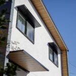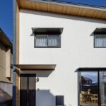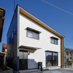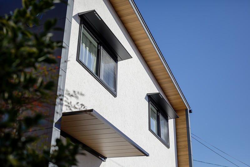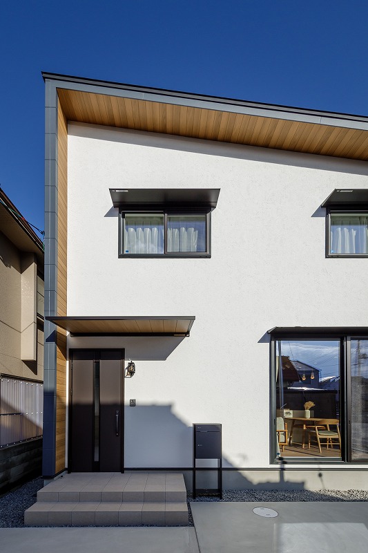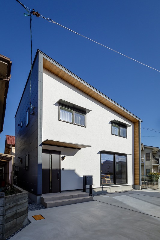 ●落ち着いた白色の塗り壁に木目とネイビーがアクセントの外観