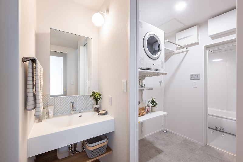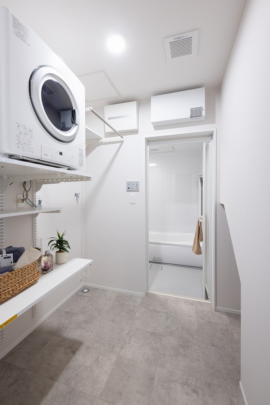 ●脱衣室は乾太くんと洗濯機がスッキリ納まり、洗濯物の収納スペースも確保
