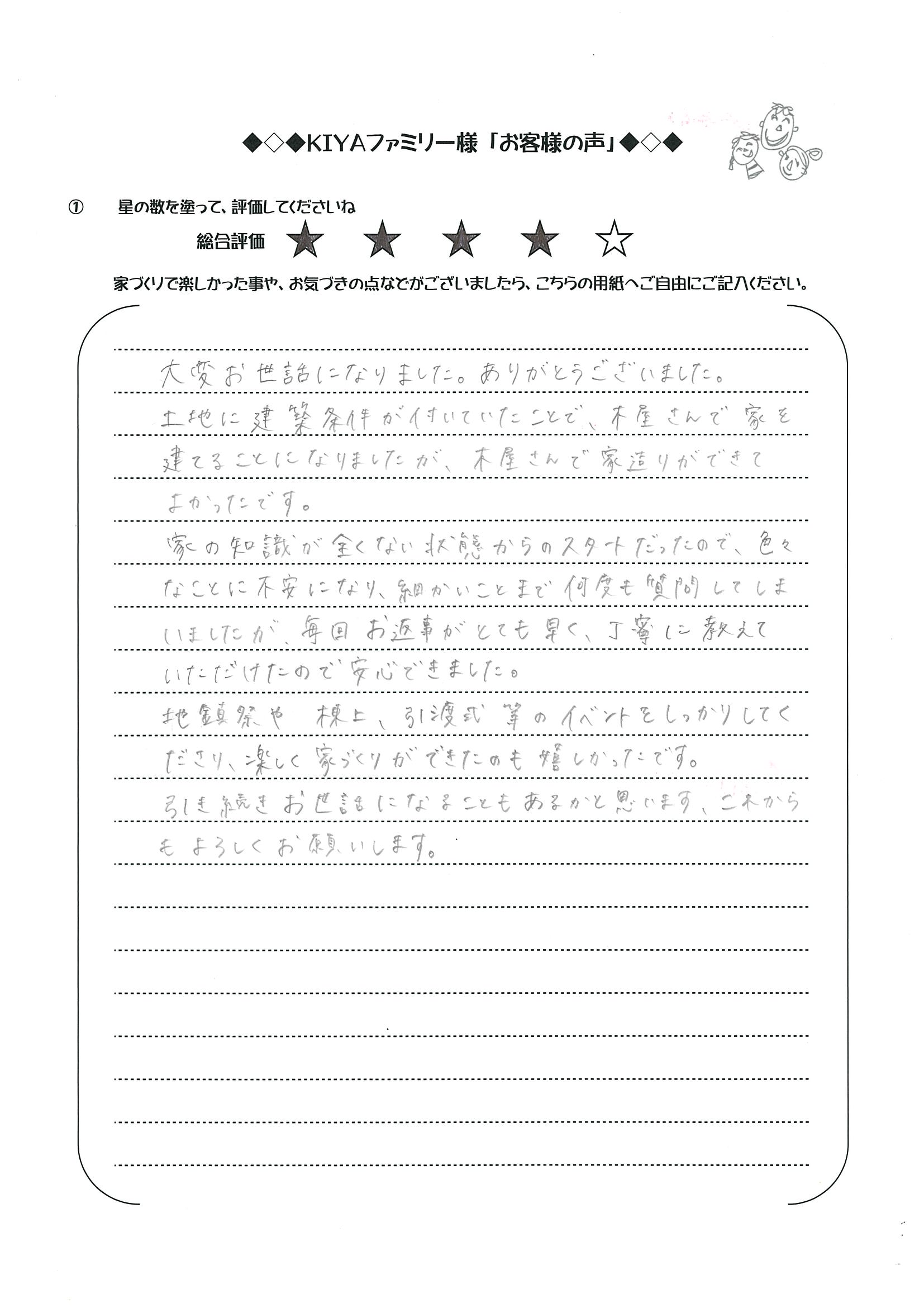 とても住みやすく心地の良い家ができたと思います。 家を建てよう(買おう)と決めてから様々なハウスメーカーに足を運びました。その中で私達夫婦の話を一番きちんと聞いてくださったのが木屋さんでした。 内装、外構ともにこだわりが […]