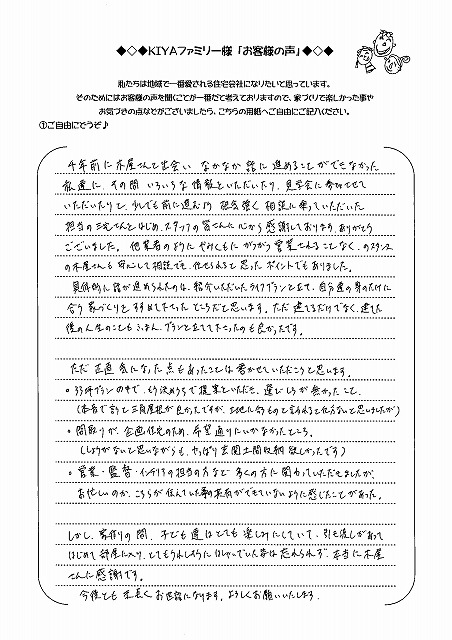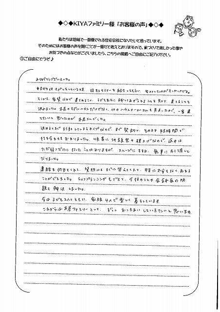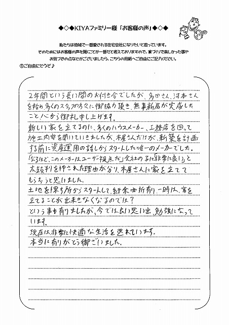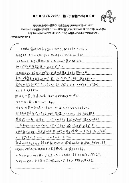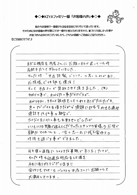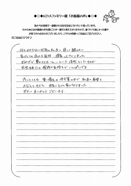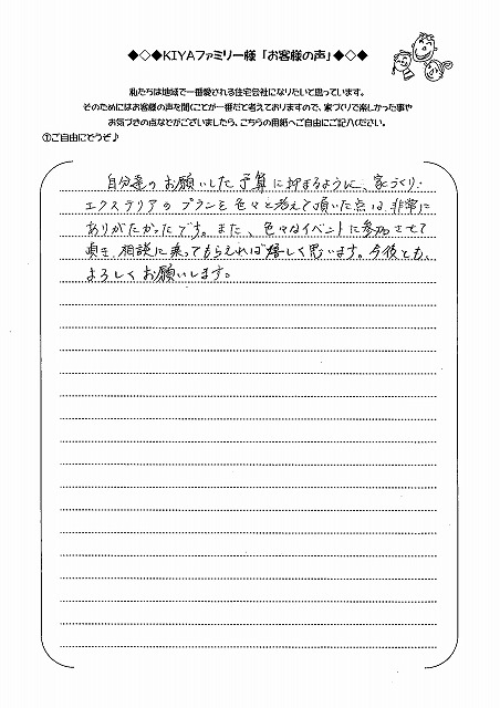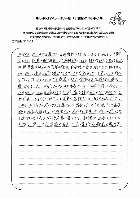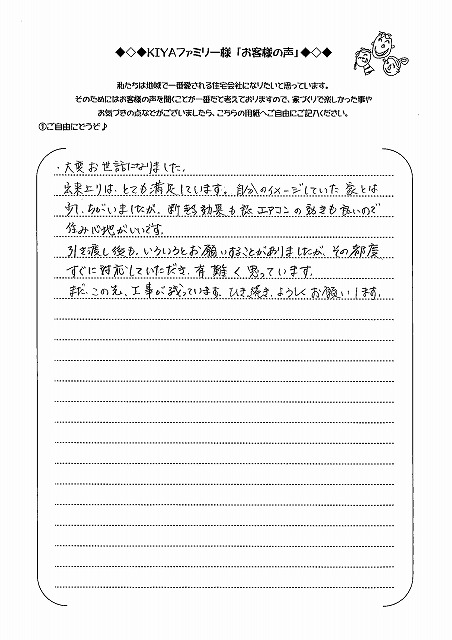 玉野市(2017年1月完成) お客様の声 玉野市 2017年1月完成 他のハウスメーカーさんも見ましたが 一番建てたいと思ったのが木屋さんでした。 ありがとうございました。 中古物件さがしをしている時、得するセミナーを紹介してもらい、参加したのがきっかけです。そ […] 続きを読む