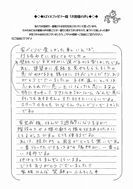 倉敷市 SA-HOUSE(2017年1月完成) お客様の声 SA-HOUSE 2017年1月完成 家族みんな笑顔が 増えました。 家づくりで楽しかった事といえば、打ち合せに行くことでした。 特にキッチン!!リクシルのショールーム なんど見に行ってもあきません。 また行きたいくらい […] 続きを読む