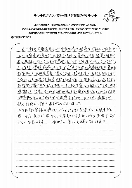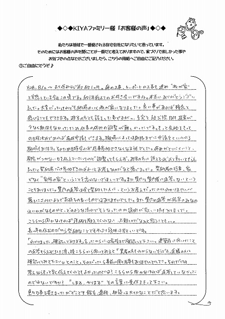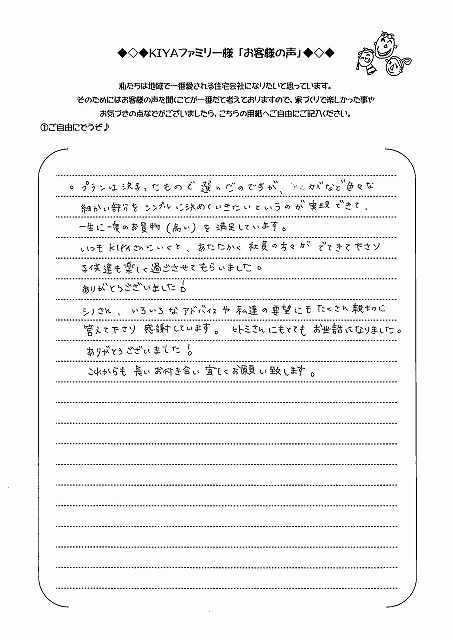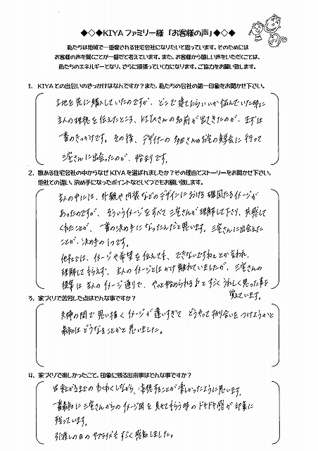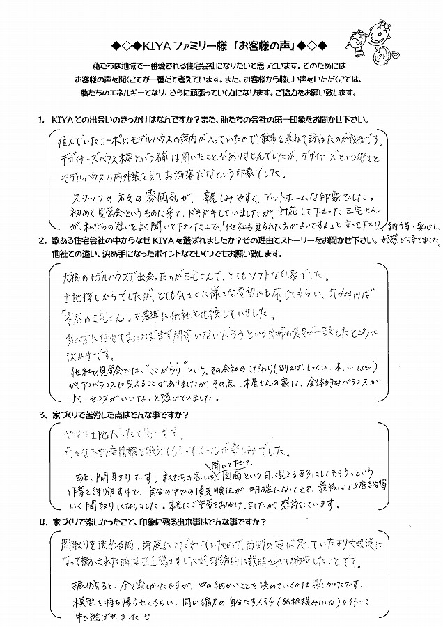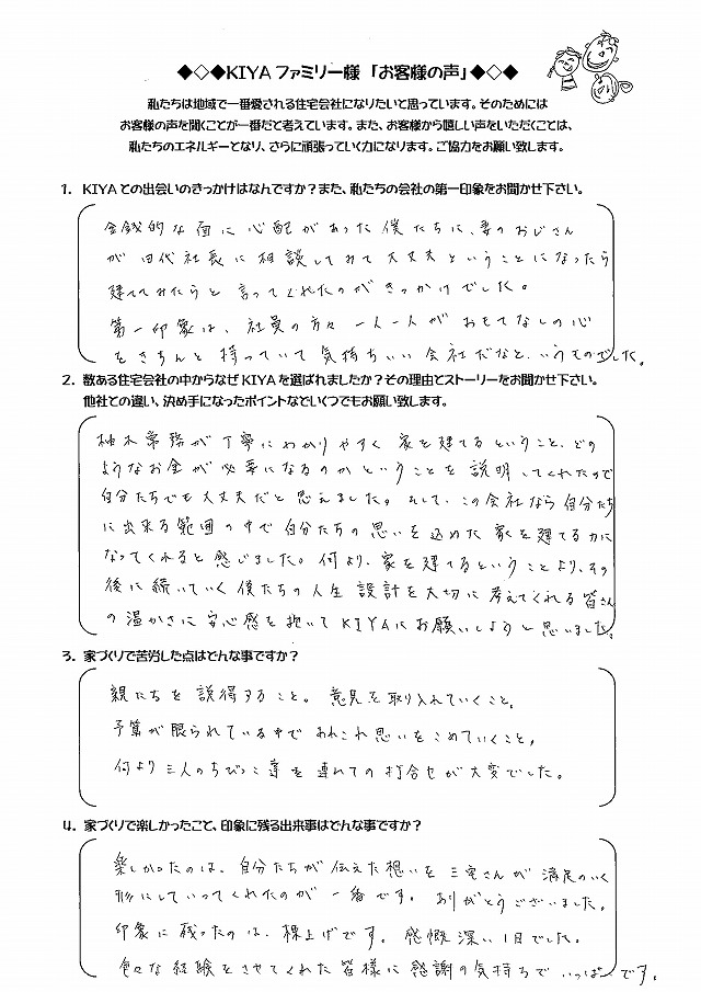 倉敷市児島 TA-HOUSE (2015年12月完成) お客様の声 TA-HOUSE 2015年12月完成 外観と内装の色合いにこだわりました。 すごく快適に過ごしています。 1. KIYAとの出会いのきっかけは何ですか?また、私たちの会社の第一印象をお聞かせ下さい。 →土 […] 続きを読む
