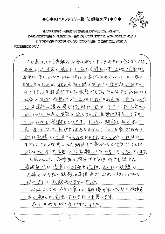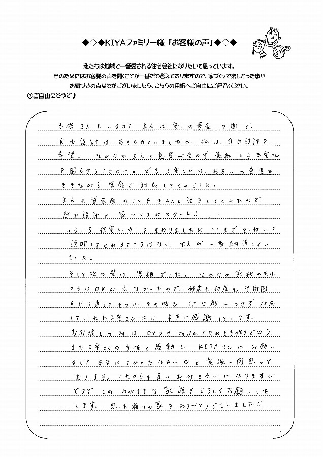 岡山市南区 NA-HOUSE (2016年8月完成) お客様の声 NA-HOUSE 2016年8月完成 KIYAさんにお願いをして本当によかったなぁー と家族一同思っております。 子供3人もいるので、主人は家の資金の面で自由設計はあきらめていましたが、私は自由設計を希望。なかなか主人と […] 続きを読む
