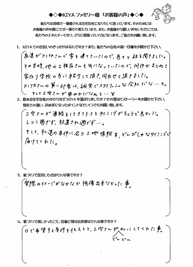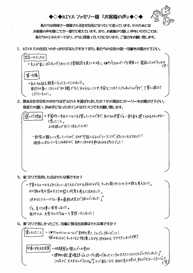 倉敷市真備町 KA-HOUSE (2015年9月完成) お客様の声 KA-HOUSE 2015年9月完成 こちらが出していた条件にドンピシャな 土地を見つけて頂き、感謝でした。 1. KIYAとの出会いのきっかけは何ですか?また、私たちの会社の第一印象をお聞かせ下さい。 →きっかけはアパ […] 続きを読む