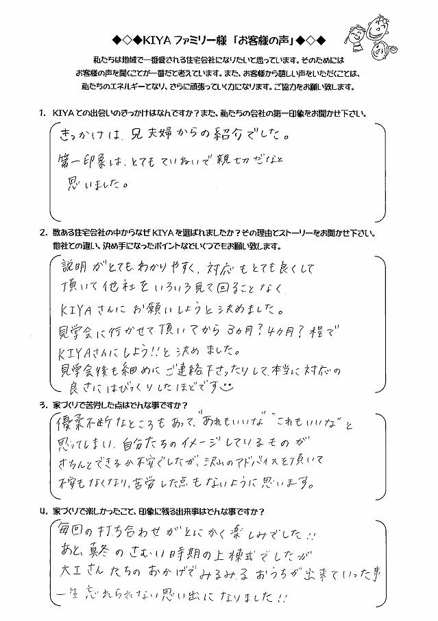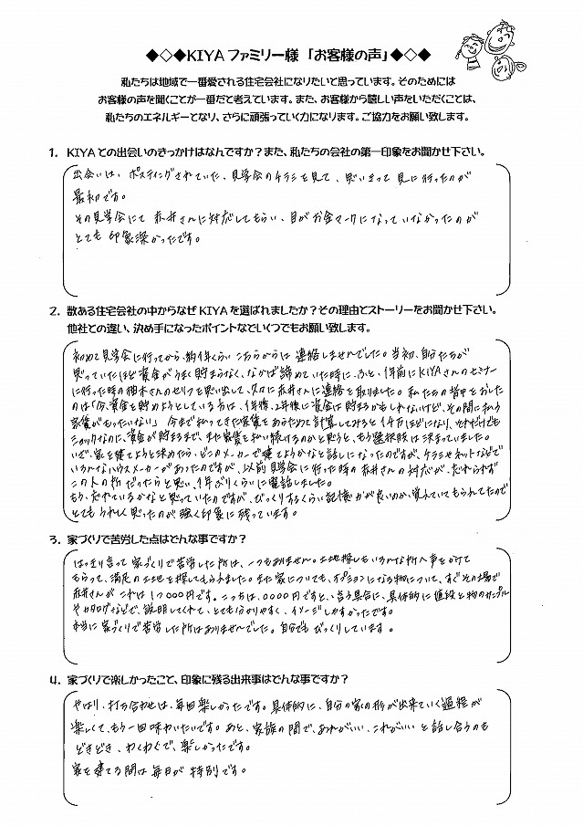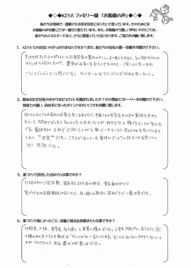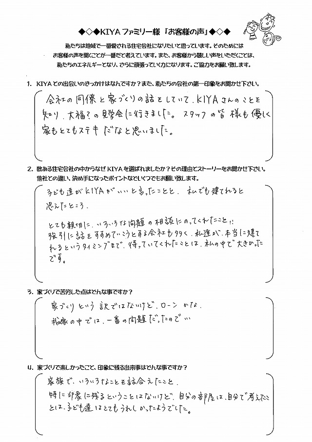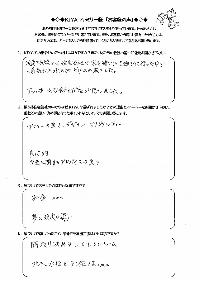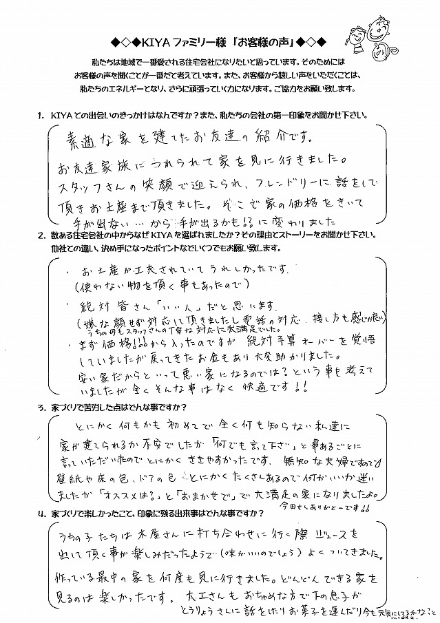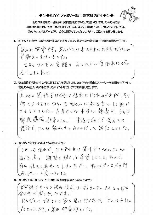 岡山市北区 MI-HOUSE (2015年4月完成) お客様の声 MI-HOUSE 2015年4月完成 素敵な家を建てたお友達 の紹介で、お土産が工夫 されていてうれしかったです。 1. KIYAとの出会いのきっかけは何ですか?また、私たちの会社の第一印象をお聞かせ下さい。 →素敵な家 […] 続きを読む
