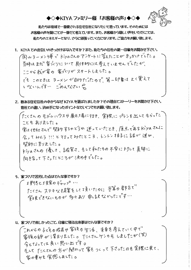 岡山市北区 WA-HOUSE (2015年3月完成) お客様の声 WA-HOUSE 2014年6月完成 私たちの不安に対して真摯に 向き合って下さったところ。 1. KIYAとの出会いのきっかけは何ですか?また、私たちの会社の第一印象をお聞かせ下さい。 岡山ラーメン博でKIYAさんのア […] 続きを読む