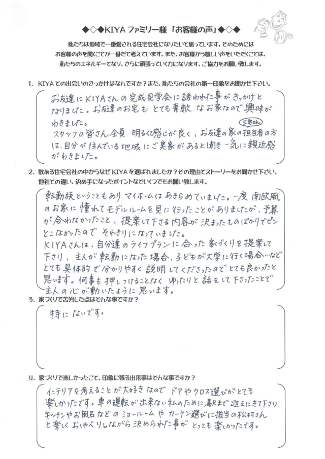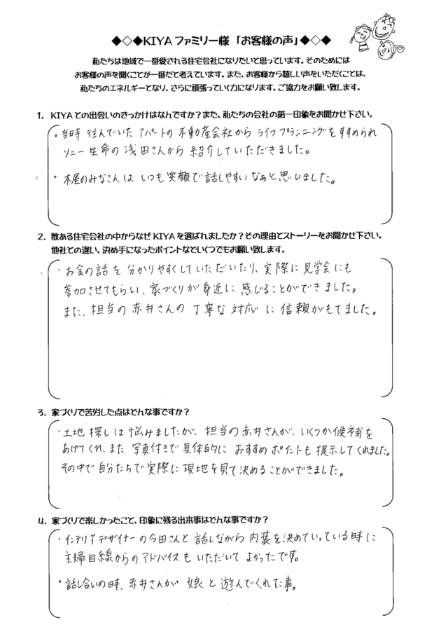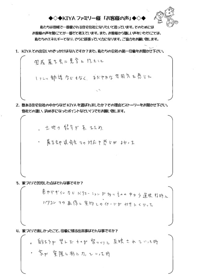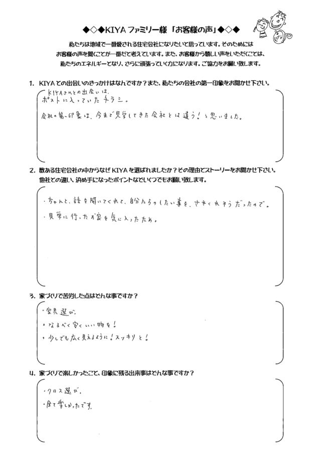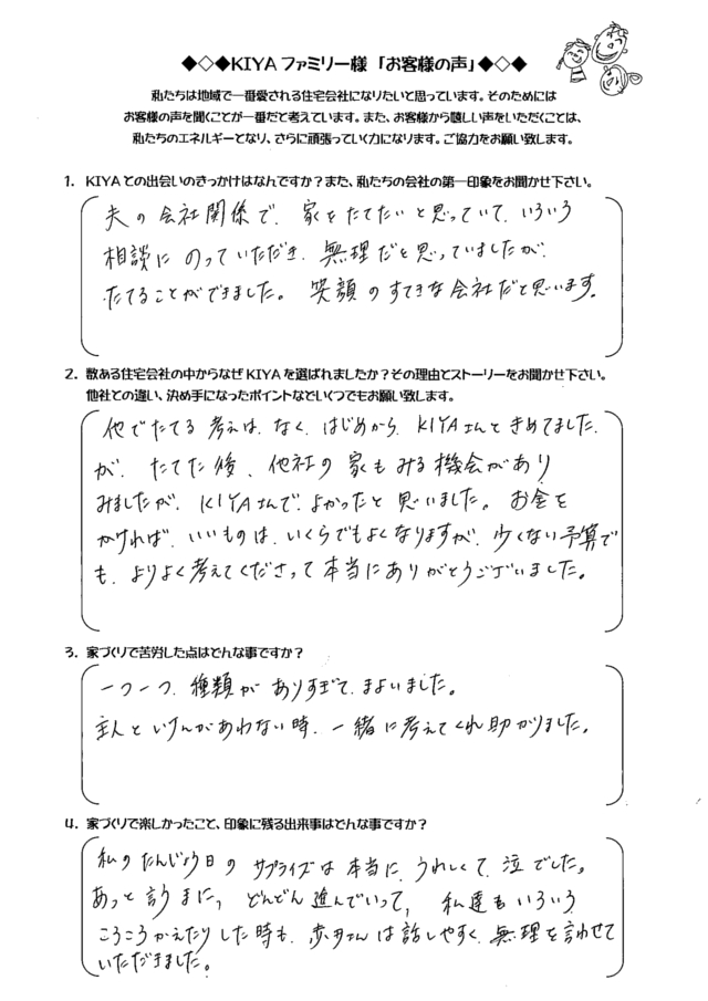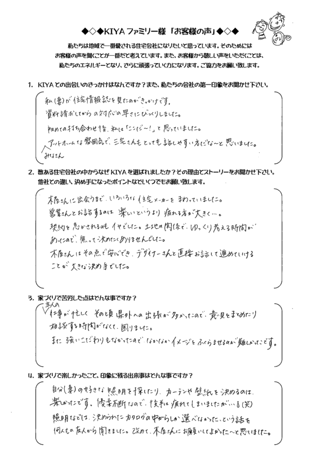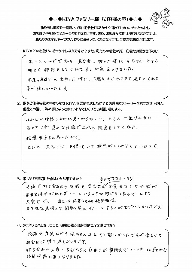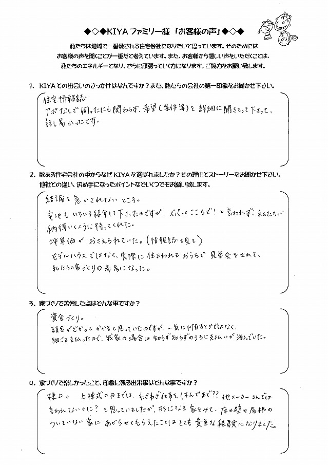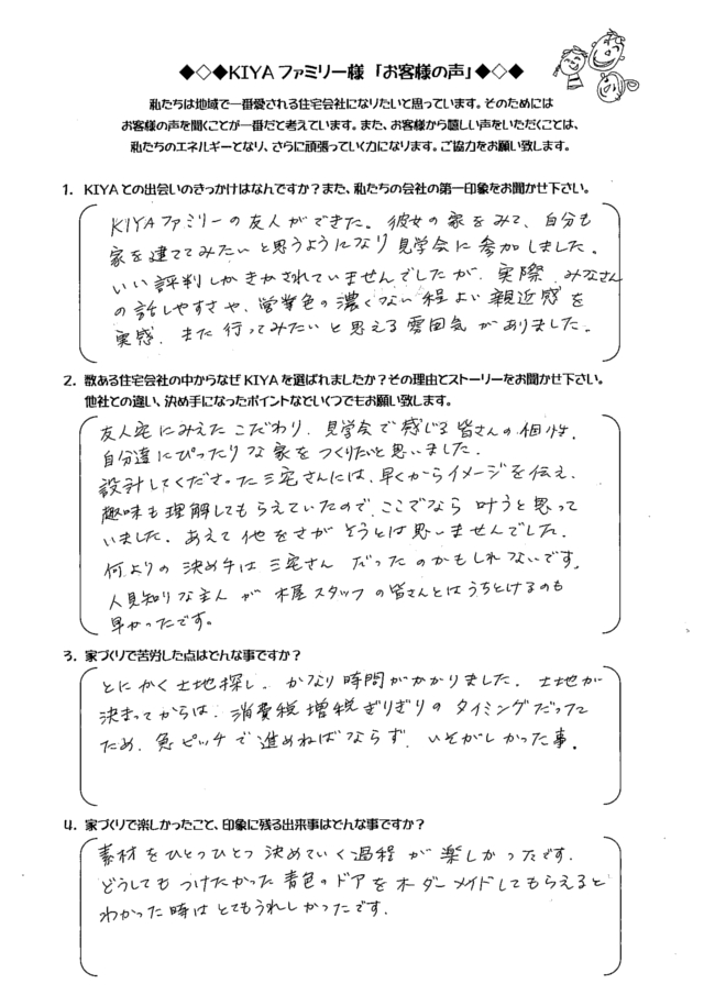 倉敷市西阿知 TA-HOUSE (2014年12月完成) お客様の声 TA-HOUSE 2014年12月完成 自分たちのライフプランに合った 家づくりを提案してくれた。 1.KIYAとの出会いのきっかけは何ですか?また、私たちの会社の第一印象をお聞かせ下さい。 お友達にKIYAさんの完成見 […] 続きを読む