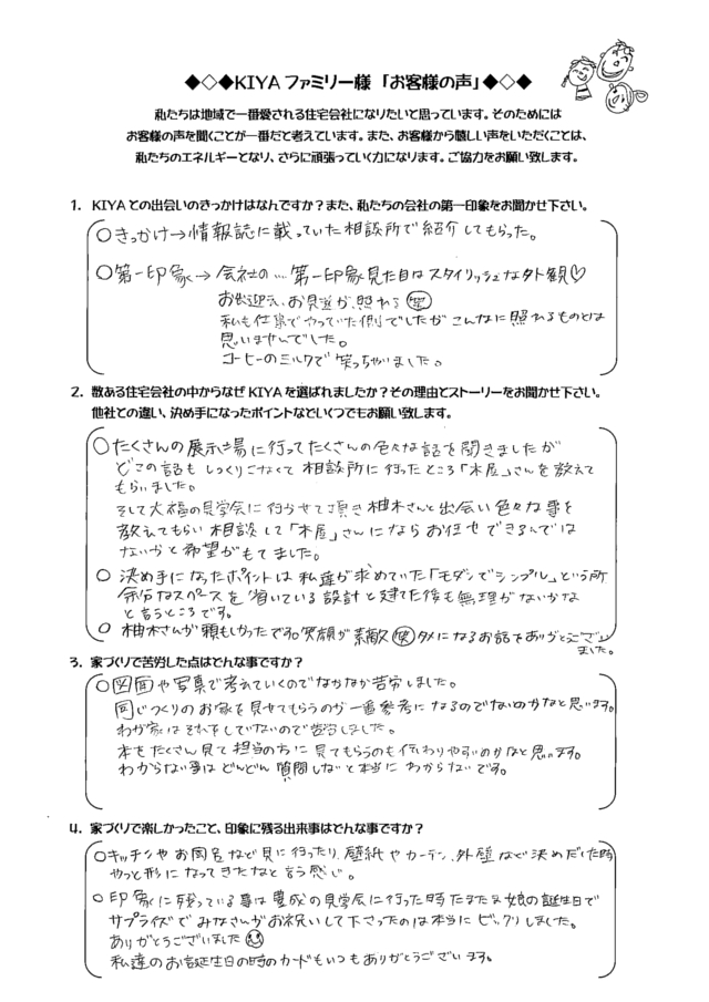 岡山市北区 KA-HOUSE (2015年2月完成) お客様の声 KA-HOUSE 2015年6月完成 しつこい勧誘もなく 対応や感じがよかった。 1. KIYAとの出会いのきっかけは何ですか?また、私たちの会社の第一印象をお聞かせ下さい。 完成展示会に見学に行ったこと しつこい勧誘な […] 続きを読む