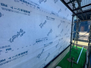 建物を雨水から守るための防水シートを施工しています。