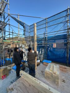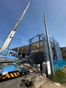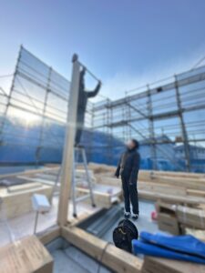 朝から職人さんたちの連携により、柱や梁が次々と組み上がっていきます。