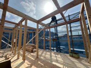 いよいよ棟上げ当日を迎えました!当日は天候にも恵まれ、作業は順調に進みました。