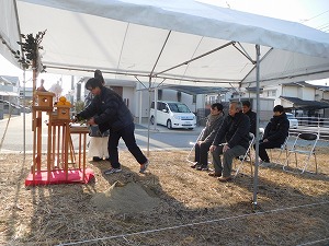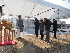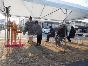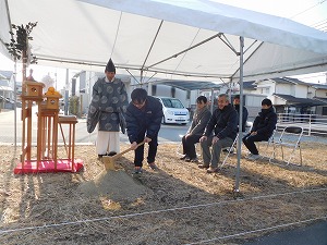 MO-HOUSE 工事中レポート ZEH住宅 岡山市南区藤田 平成30年6月完成 <2018.2.17> 地鎮祭の日を迎えました! ご家族で竹を立てて、地鎮祭準備完了です! 清々しい朝の空気に包まれながら、地鎮祭スタートです! 祝詞を奏上し、土地の神様に建築の報告を行います。 土地の四隅をお祓いし、清める「四方祓い」 「鍬入れの儀」!ご主人様の気合いの一振りです! 続いて奥様! 参加者全員での「玉櫛奉奠」 工事の無事を祈念して乾杯し、地鎮祭の終了です。 恒例の記念撮影♪ おめでとうございます! これからどんどん工事が進んでいきますので よろしくお願いします! <2018.2.24> 地盤改良工事が始まりました。 地中にコンクリートの柱を形成していきます。 <2018.3.15> 型枠を組み、その中にコンクリートを打設していきます! <2018.3.29> 棟上げ工事当日を迎えました! 工事開始と共に、柱や梁を組んでいきます! 2階の床下地材「剛床」の施工です。 2階部分も柱と梁をどんどん組んでいきます! 屋根の垂木を施工中です。順調です! 屋根の下地合板を施工中! 屋根にアスファルトルーフィングを施工し 本日の作業は終了です! 恒例の記念撮影♪これからどんどん工事が進みます。 宜しくお願いします!! <2018.4.5> フローリングを施工しています! <2018.4.13> ユニットバスを施工しています! <2018.4.17> 壁にボードを施工しています! <2018.5.9> クロス工事が始まりました。 クロスを張る前の下地処理です! <2018.5.15> 壁にクロスを張っています。 完成が近づいてきました! <2018.5.17> 玄関にタイルを施工しています! <2018.6.5> 閑静な住宅地にモダンなお家が 完成しました! キッチン周りのデザインが とても素敵です! これから楽しい思い出たくさん つくって下さい! <2018.6.15> 遂にお引渡しの日を迎えました! ご夫婦揃って鍵を開けて頂きました! 恒例の記念撮影です♪ありがとうございました! これからも宜しくお願いします! 関連記事 KA-HOUSE KE-HOUSE KO-HOUSE A-HOUSE 投稿ナビゲーション SH-HOUSEAO-HOUSE