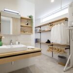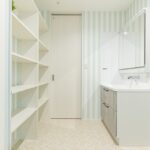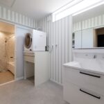おしゃれで広い洗面脱衣室には、室内干しや衣類を掛けられ家事のしやすさをしっかり考えた設計。